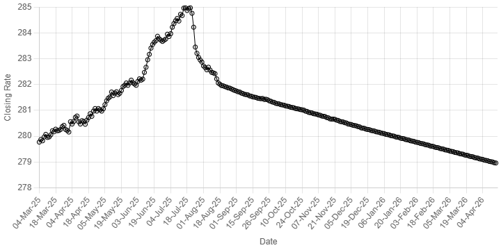 On Tuesday, the local unit closed at 278.97.