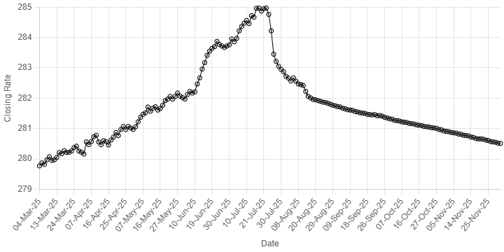 On Monday, the local unit closed at 280.51.