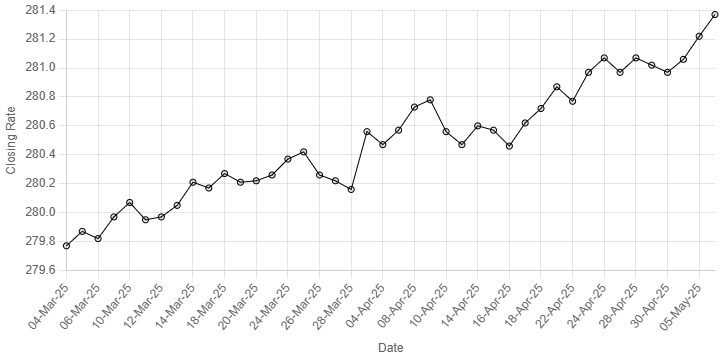 “25-Mar-25”, “26-Mar-25”, “27-Mar-25”, “28-Mar-25”, “03-Apr-25”, “04-Apr-25”, “07-Apr-25”, “08-Apr-25”, “09-Apr-25”, “10-Apr-25”, “11-Apr-25”, “14-Apr-25”, “15-Apr-25”, “16-Apr-25”, “17-Apr-25”, “18-Apr-25”, “21-Apr-25”, “22-Apr-25”, “23-Apr-25”, “24-Apr-25”, “25-Apr-25”, “28-Apr-25”, “29-Apr-25”, “30-Apr-25”, “02-May-25”, “05-May-25”, “06-May-25”
