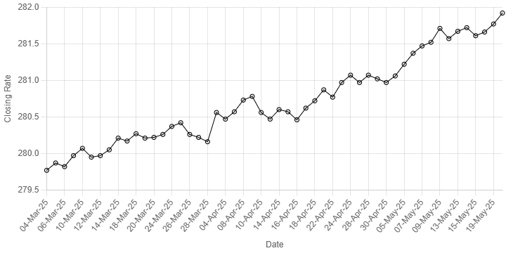 “25-Mar-25”, “26-Mar-25”, “27-Mar-25”, “28-Mar-25”, “03-Apr-25”, “04-Apr-25”, “07-Apr-25”, “08-Apr-25”, “09-Apr-25”, “10-Apr-25”, “11-Apr-25”, “14-Apr-25”, “15-Apr-25”, “16-Apr-25”, “17-Apr-25”, “18-Apr-25”, “21-Apr-25”, “22-Apr-25”, “23-Apr-25”, “24-Apr-25”, “25-Apr-25”, “28-Apr-25”, “29-Apr-25”, “30-Apr-25”, “02-May-25”, “05-May-25”, “06-May-25”, “07-May-25”, “08-May-25”, “09-May-25”, “12-May-25”, “13-May-25”, “14-May-25”, “15-May-25”, “16-May-25”, “19-May-25”, “20-May-25”