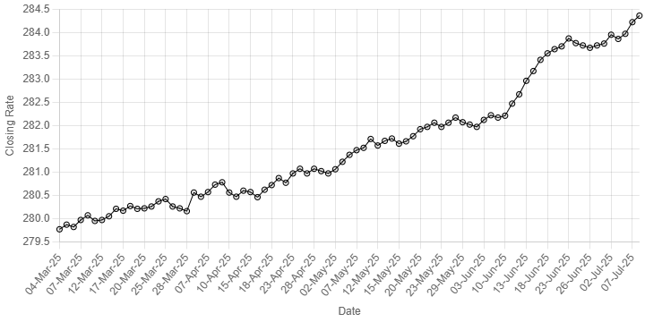 On Monday, the currency settled at 284.22.