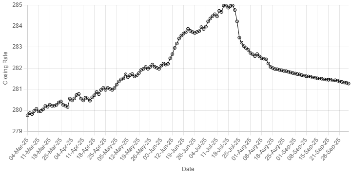 On Wednesday, the local unit closed at 281.31.