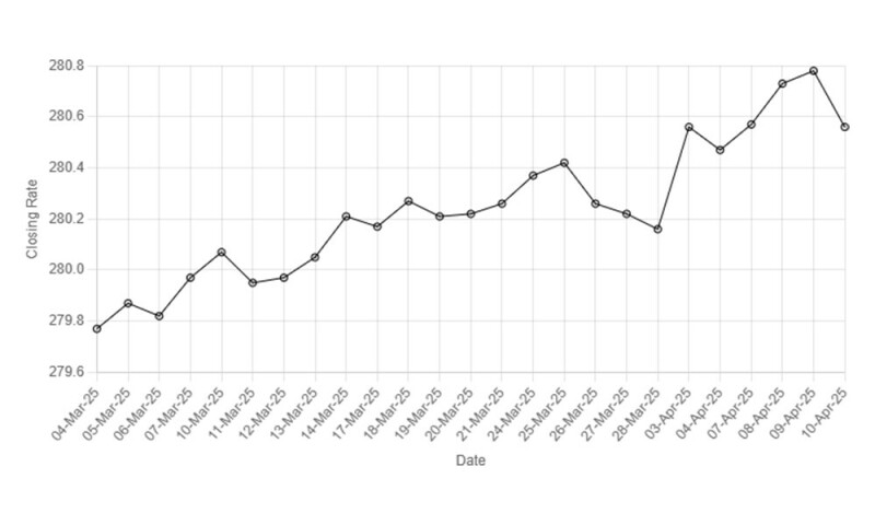 On Wednesday, the currency settled at 280.78.