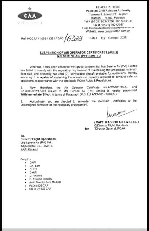 “Therefore, the air operator certificate …. issued to Serene Air is hereby suspended with immediate effect … accordingly, you are directed to surrender the aforesaid certificates to the undersigned forthwith for the necessary endorsement.”