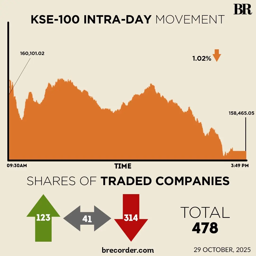 On Tuesday, PSX witnessed a sharp and broad-based sell-off as heavy institutional offloading and profit-taking drove the index into a steep decline. The KSE-100 Index plunged by 2,062.78 points, or 1.27%, to close at 160,101.03.