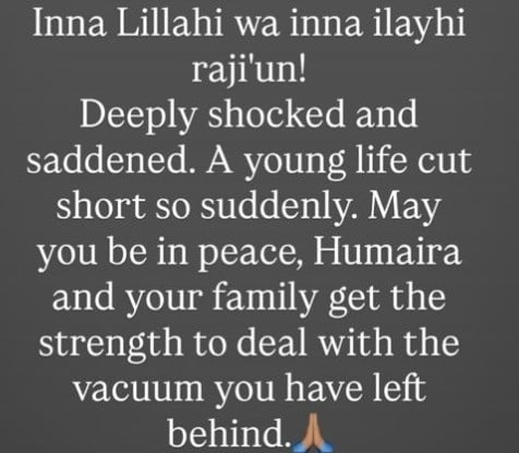 Veteran actor Humayun Saeed took to Instagram, expressing “Deeply sorry for this sudden and shocking loss. May Allah Bless Humaira’s soul. Heartfelt condolences”