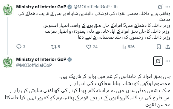 Interior Minister Mohsin Naqvi condemned the “blast near a bus on the Noshki-Dalbandin Highway” and expressed his grief over the loss of five lives.