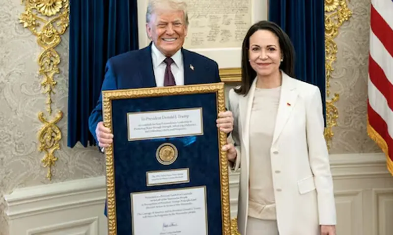 WASHINGTON: Venezuelan opposition leader Maria Corina Machado gave her Nobel Peace Prize medal to US President Donald Trump on Thursday during a White House meeting, in a bid to influence his efforts to shape her country’s political future.